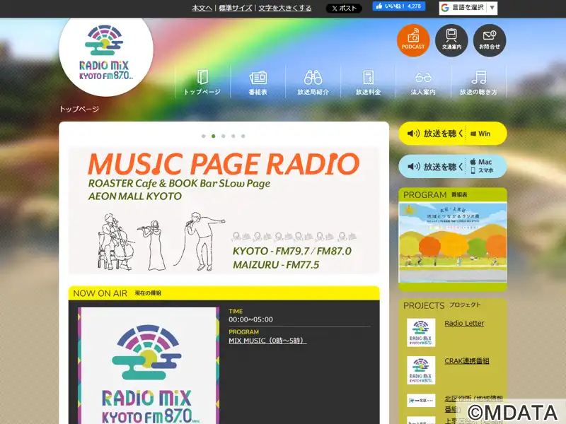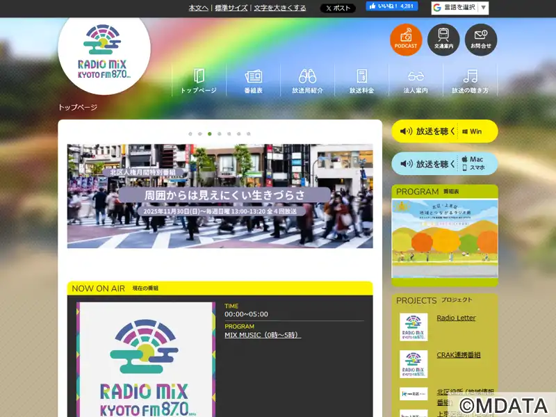 「ラジオミックス京都」はNPO法人コミュニティラジオ京都が運営するコミュニティFM局で、「地域と大学の連携」がテーマ。2016年5月22日、周波数87.0MHzで京都市北区・上京区を主なサービスエリアとして開局。メインスタジオは北大路烏丸・大垣書店ビルの4Fにあり、大学・学生・地域の連携により、地元情報や防災情報、京都の魅力を発信。番組制作には大学生も参加し、地域交流や活性化にも力を入れている。
