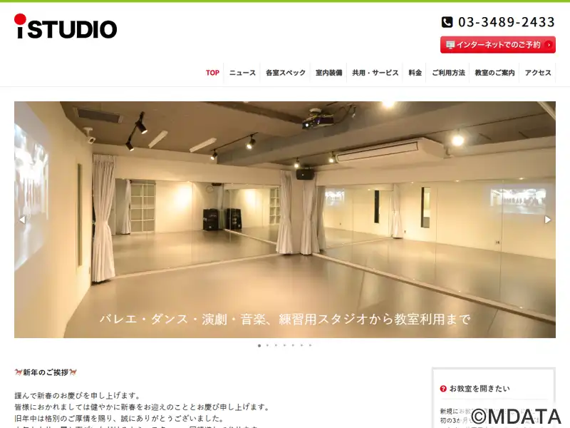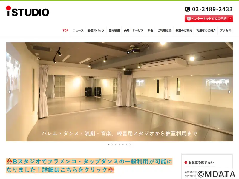 狛江市和泉多摩川駅から3分の場所にある多目的スタジオ。床材には衝撃吸収ゴムと木で組んだ二重床と、ダンス床の最高峰TMフロアを採用。音響設備もエレクトロボイス社のスピーカーなど高性能な機材をしなえる。Aスタジオ、Bスタジオはダンスや演劇の稽古に、Cスタジオはタップダンスやフラメンコ、ボーカルの練習に、最も広いDスタジオはグループレッスンや公演のリハーサルに利用できる。ダンスやヨガ、バレエなどの教室開講。