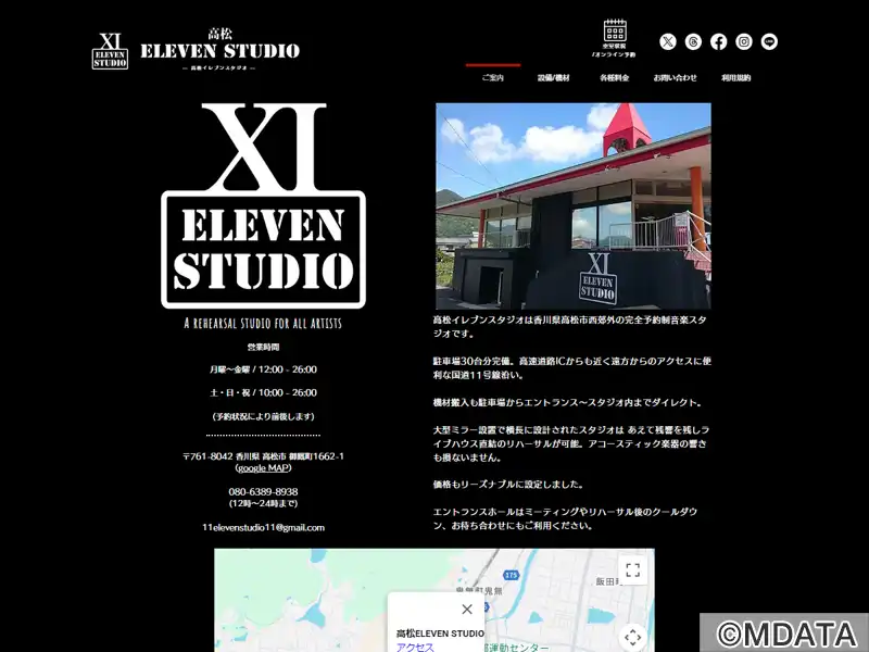 香川県高松市西郊外、御厩町と国分寺町境目、国道11号線沿いにある完全予約制音楽スタジオ「高松イレブンスタジオ」。駐車場は30台分完備。広めのエントランス、ミーティングや待ち合わせにもご利用いただけるロビー、ライブリハーサル向け14畳のレンタルルーム2部屋をご用意いたしております。機材持ち込みに適した設計ですので、普段使用の難しい自前の機材をぜひお持ちください。