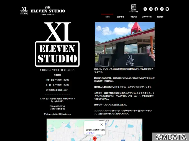 香川県高松市西郊外に位置する完全予約制の音楽リハーサルスタジオ。国道11号線沿いの郊外立地を活かした広い敷地に、14畳のリハーサルルームを2部屋備える。ライブハウスに近い臨場感を意識し、適度な残響を残した音響設計を採用。全面鏡張りの空間は、バンド、アコースティックに定評。エントランスに隣接するロビーはリハーサル前後のミーティングや交流にも活用でき、地域の音楽コミュニティの拠点としての役割も担う。