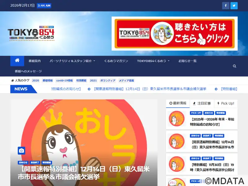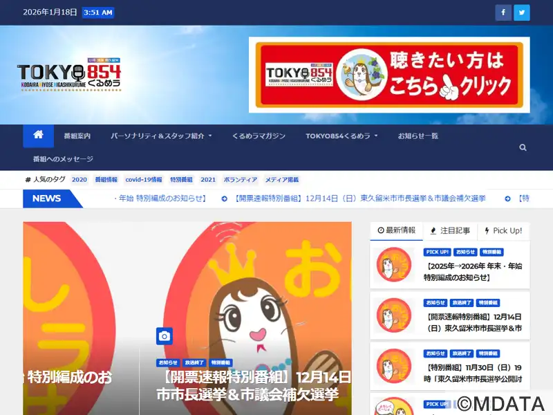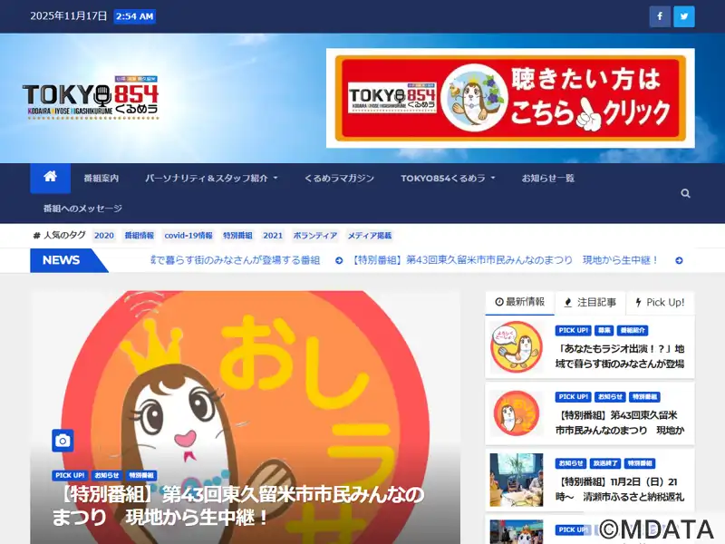 周波数85.4MHz。2018年6月30日に開局した東久留米市のコミュニティFM。NPO法人FMひがしくるめを前身とする(株)クルメディアが運営。成美教育文化会館1Fのスタジオから朝8時から夜10時まで14時間の生放送(自社制作番組)。FMプラぷらでサイマル配信。東久留米市と「災害協定」を締結。2021年7月5日より旧FMひがしくるめから「TOKYO854くるめラ」に局名変更。JOZZ3CN-FM。