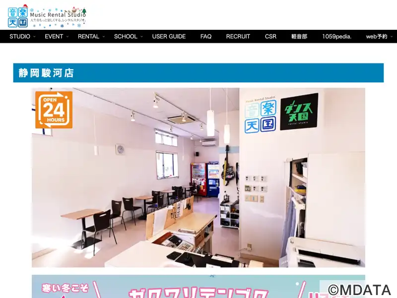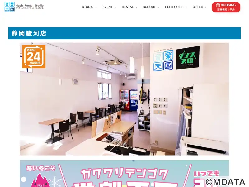 静岡県静岡市駿河区に、音楽天国1号店として2007年にオープンした音楽スタジオ。全5部屋と広々としたロビーを備え、各スタジオにはミラーや防音・音響設備が整っている。ドラムセットやアンプ、PA機器など定番の機材を常設し、マイクや譜面台、エフェクター、電子ピアノ、録音機材なども貸し出している。練習だけでなく、録音や動画撮影、配信、イベント開催、シェアスペースとしての利用にも対応。音楽教室も開講している。