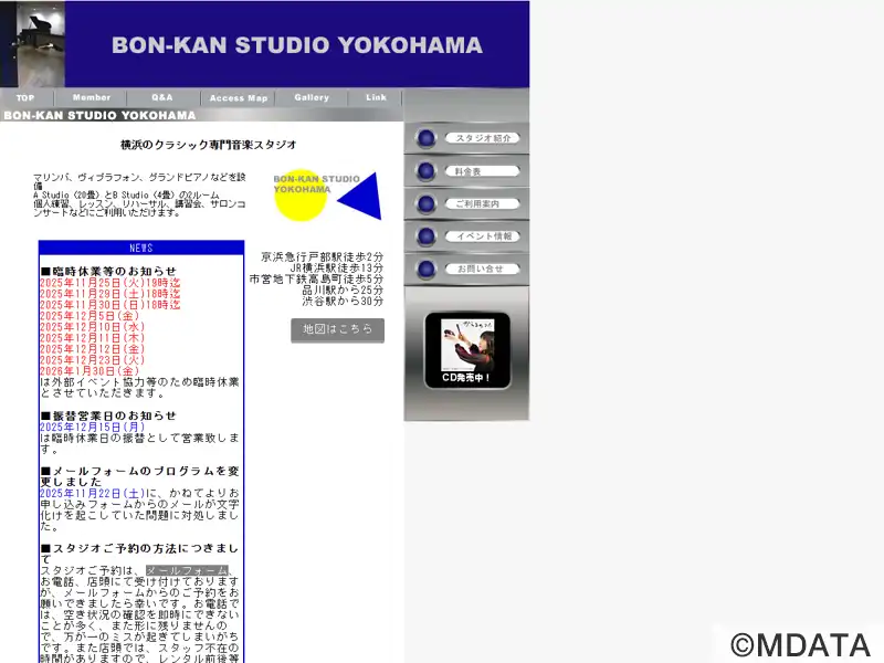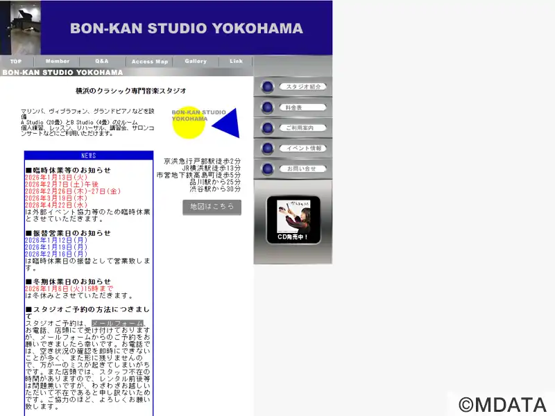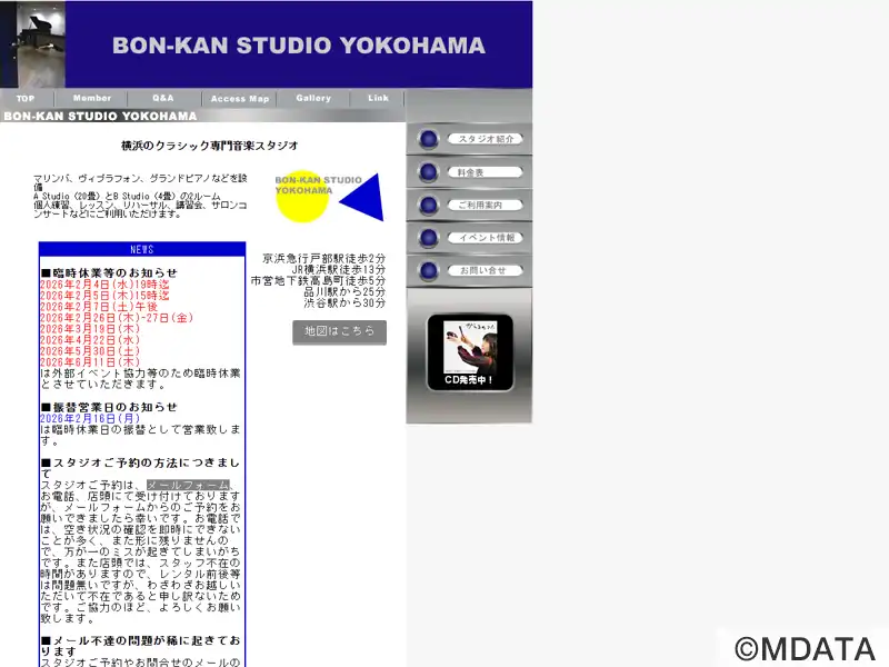 横浜市戸部駅近くの音楽スタジオ。Aスタジオはには、グランドピアノヤマハG2、天吊りマイク、モニターカメラなどを完備し、レコーディング、講習会、サロンコンサートなど、様々な用途に利用できる。Bスタジオは、個人練習や個人レッスン、イベント時の控え室やコントロールルームとしても利用できる。また、マリンバ、ヴィブラフォン、グロッケン、スネア、コンガ、ボンゴ、ジャンベ、カホンなど打楽器も充実しているのも特徴。
