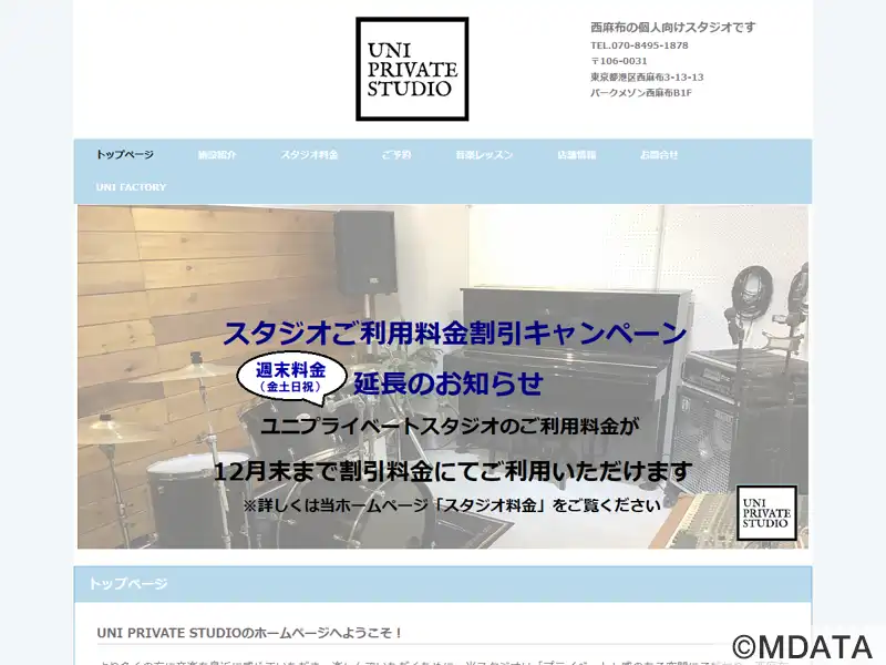 東京西麻布の外苑西通りにある、個人向け音楽スタジオ。約14畳のスタジオに、アップライトピアノ(YAMAHA U1)や、定番のアンプ、ドラムセットを完備。少人数での個人練習やレッスンにも最適な空間を提供している。プライベート感を重視したスタジオで、弦楽器やヴォーカルの練習にも対応する設備を揃え、55インチのテレビモニターも完備。待合室も約5畳の広さがあり、利用前後にリラックスできる環境が整っている。