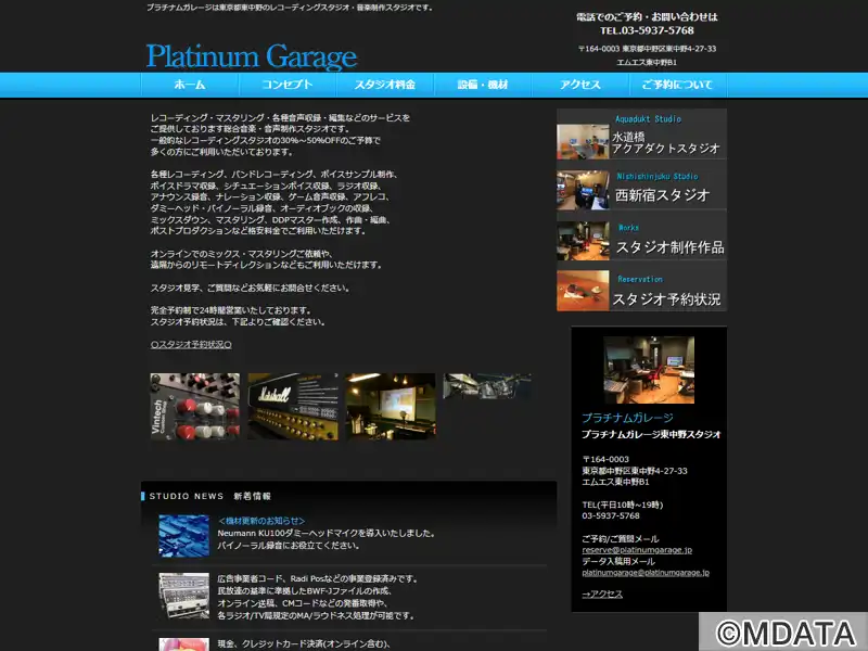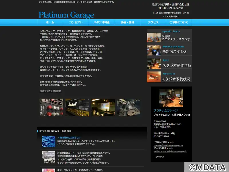 東京東中野に位置するレコーディングスタジオ。音楽制作に特化し、プロツールスや業務用マイクプリなどの高品質な機材とエンジニアの高いスキルが特徴。リラックスできる環境の中で、コントロールルーム、録音ブース、サブブース、ミーティングスペースを備え、Pro Toolsを中心としたプロ仕様のDAW環境、真空管マイクプリアンプ、コンデンサーマイクなどの業務用機器を備える。プロからアマチュアまで幅広くサービス提供。