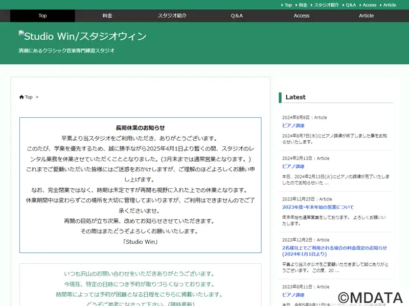 清瀬市に2021年1月オープンした24時間完全防音、グランドピアノを常設したクラシック音楽専門練習スタジオ「スタジオウィン」。西武池袋線「清瀬駅」南口徒歩5分の閑静な住宅街にあるアットホームな雰囲気の音楽スタジオえ、フローリング床、2・3名様までご入室可能。ピアノ練習室としてはもちろん管楽器・弦楽器・声楽のレッスンや個人練習にも利用できる。※2025年4月より当面のあいだ休業中。