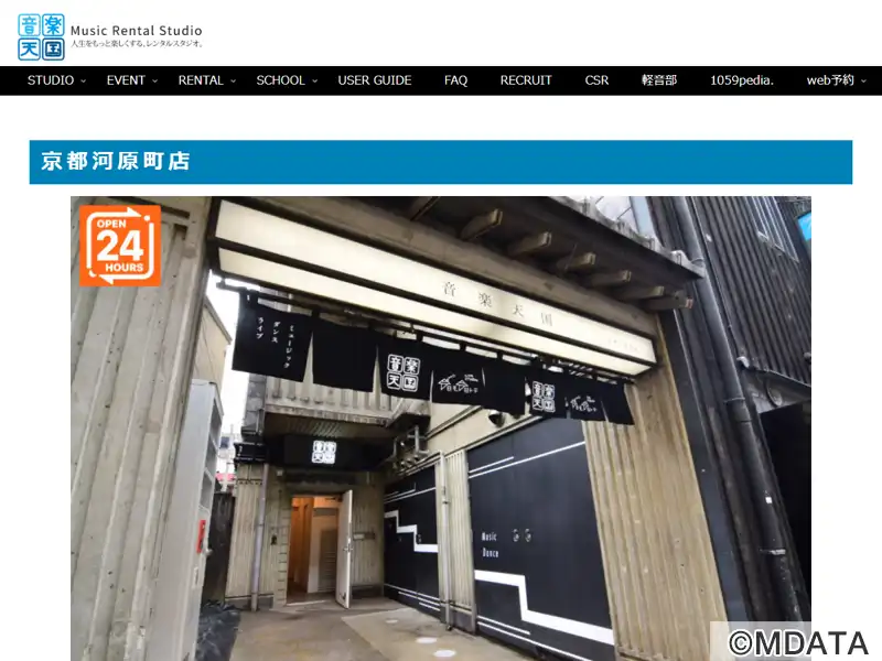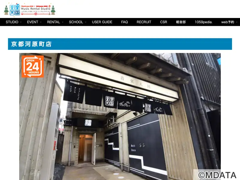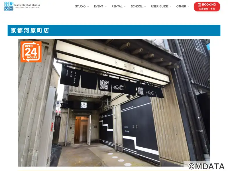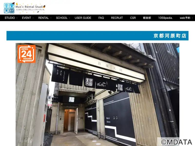 旧T'S studioから事業譲渡、2021年5月より音楽天国・京都河原町店としてリニューアルオープン。木屋町、高瀬川ほとりの黒暖簾が目印。3~4Fに8部屋の練習スタジオ、4Fに旧インディゴを引き継ぐライブスタジオ「今日モ今日トテ」。スタジオ7はアップライトピアノ設置のピアノ練習室。バンド・楽器練習、ダンス、音楽教室レッスン、スタジオライブや動画配信・クロマキー撮影など幅広く利用可能。