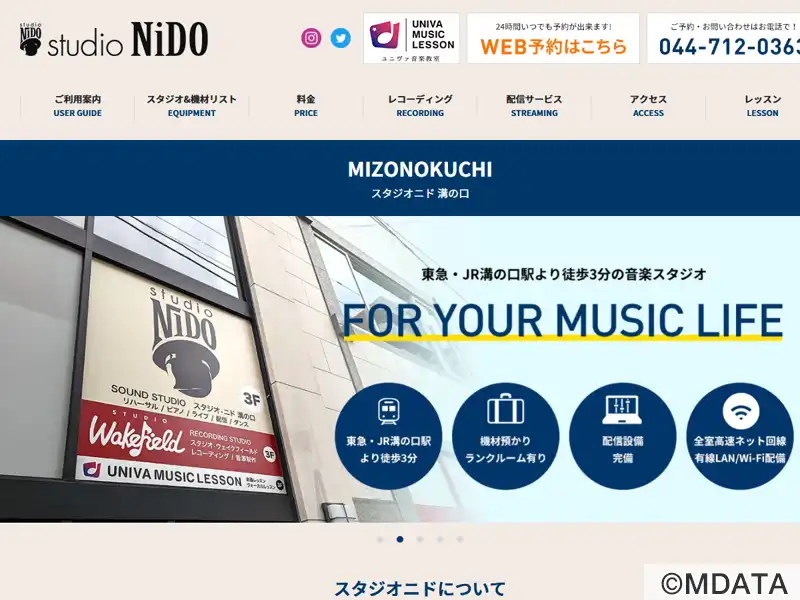溝の口に2022年7月オープンのstudio NiDO2号店。リハーサルスタジオ5部屋(32帖、13帖×2、11帖、10帖)、ピアノスタジオ2部屋(2.5帖、アップライトピアノ有)。全室有線LAN完備。バンドリハ・個人練習、ダンス練習、ゲネプロや配信ライブ、有観客ライブも可能。レコーディングスタジオstudio Wakefieldを移転併設。東急田園都市線「溝の口」、JR武蔵溝ノ口駅徒歩3分。