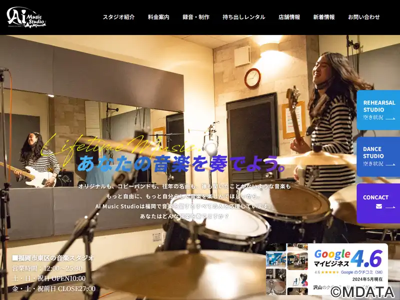 福岡市東区に位置する音楽とダンスのリハーサルスタジオ。施設には3つのリハーサルスタジオと1つのダンスレッスンスタジオを備え、初心者から上級者、子供から大人まで、様々な活動をサポートする。大編成バンドにも対応する広さと設備でスタジオライブもできるAスタジオ、吸音施工による静寂空間のBスタジオ、多様なジャンルに対応するCスタジオ、充実した音響設備を誇るダンススタジオと、それぞれが異なる特性を持っている。