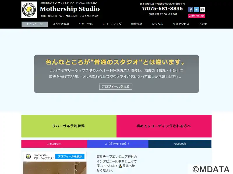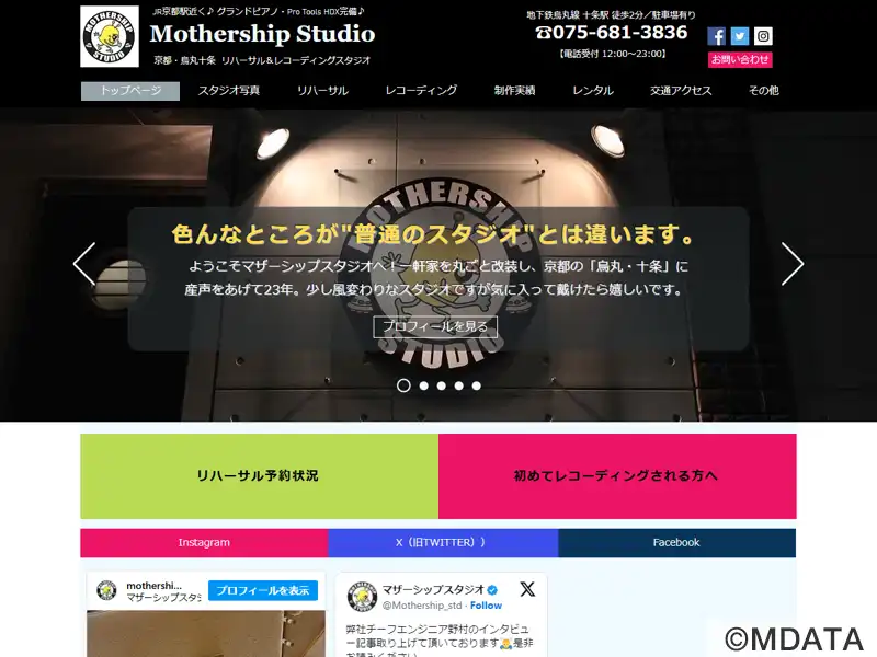 京都烏丸十条に、2002年開業した音楽スタジオ。グランドピアノ、dwのドラム、マッチレスのギターアンプなど、他のスタジオとは一味違った楽器を揃えている。スタジオブースは、26㎡の湿式浮床式で、レコーディングとリハーサルの両方に優れた音響特性を持っている。ブースの前面は鏡張りで、桜の木のフローリングと壁面のディフューザーが自然なルームアコースティックを生み出し、快適に長時間利用できる環境が整っている。