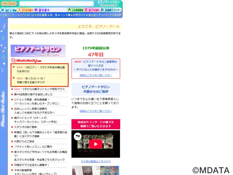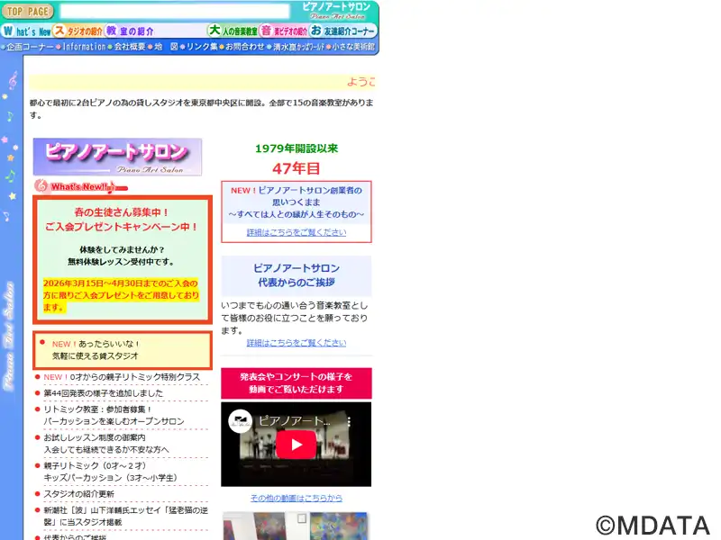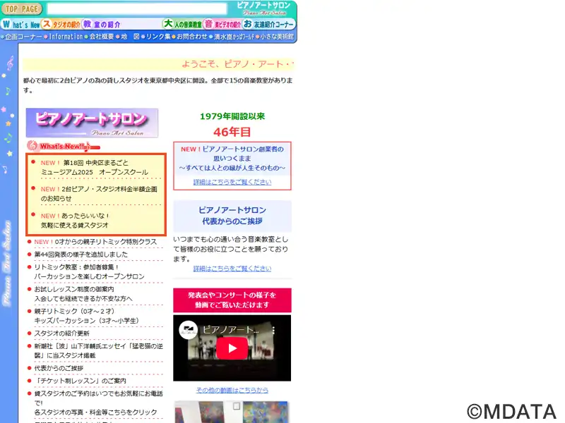 東京月島にあるピアノサロン。クラシック専門貸スタジオとして1979年に開業、2009年7月に現在地に移転オープンした。全6部屋を用意、「A Studio」は2台のピアノを備え、個人練習やアンサンブル、ミニコンサート、音楽サークル、動画撮影、最大30席を設けての小さな発表会などに利用できる。また、音楽教室も充実したコースを揃え、子ども向けの「ヤマハ音楽教室」を初め、全15コースのクラスを用意している。