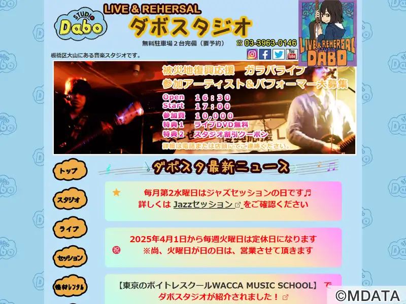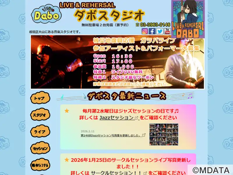 板橋区大山にある、居心地の良いアットホームなリハーサルスタジオ。バンドや個人の練習、レコーディング、ライブ・ジャズセッションなどに利用できる6つの部屋を用意。全部屋に録音用のレコーダーを完備。また、「ガラパゴススタジオ」というステージ付きの30畳の部屋では、ライブやジャムセッション、サークルセッションライブや高校生限定ライブなど、楽しいイベントを定期的開催。広々ロビーの気楽に利用できるスタジオです。