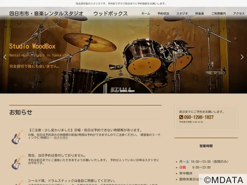 三重県四日市市にある完全貸切型の音楽レンタルスタジオ。1日1組のみの貸し切り。約17畳のスタジオには大型ミラーが設置され、照明や空調の調整も自由に行える。ドラムセットやギター・ベース用アンプ、電子ピアノ、マイクやミキサーなどの基本的な音響機材が揃い、個人練習からバンド練習、動画撮影まで対応可能。スタジオ内は土足禁止で清潔に保たれる。練習後には6畳の専用休憩室が、飲食や軽い打ち合わせに利用できる。