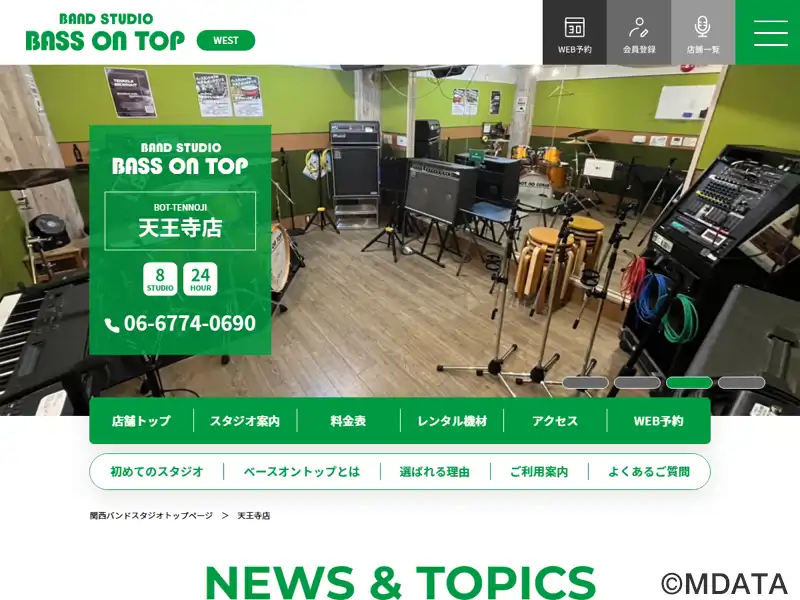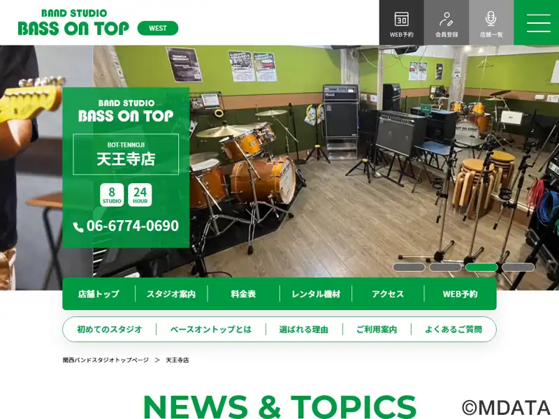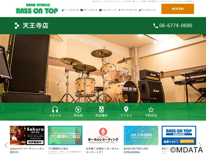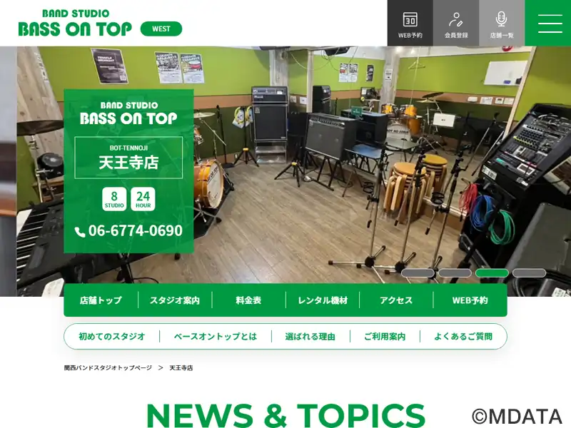 大阪市天王寺駅北口より徒歩3分の場所にあるベースオントップ天王寺店。プロからアマチュアまで、一人でもバンドにも最適なリハーサルスタジオ。ライブ前のリハーサルや個々の楽器練習、音楽レッスン、サークル活動の会場として最適。全8部屋が用意され、各部屋には特性があり、大人数対応の多目的スタジオから、コンパクトなスタジオまで全部屋に、高性能な機器を完備。各パートの音が聴こえやすい設計、録音システムも常備する。