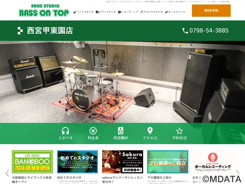 西宮市の阪急甲東園駅からわずかの距離にある音楽スタジオ。バンド練習、声楽、管楽器のリハーサルに最適な、20帖と10帖の広々としたスタジオ5部屋を備える。豊富なレンタル機材とハイスペックな設備をで、プロからアマチュアまで幅広いニーズに応える。スタジオライブの開催も可能。音楽レッスンやサークル活動の場としても利用可能できる。明るく親切なスタッフ対応が特徴で、スタジオは完全分煙の快適な環境が保たれている。