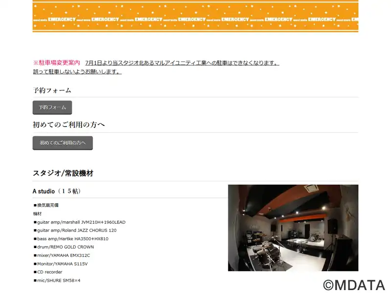 豊橋市西岩田にある音楽スタジオ。Aスタジオ(15帖)とBスタジオ(13帖)の2つの部屋を備え、換気扇完備で、マーシャル、ローランド、ハートキーのアンプや、パールのドラム、ヤマハの音響機器など定番の機材を揃える。シンプルで落ち着いた内装と防音専門の施工によるクリアな音環境で、リハーサルからレコーディング、スタジオライブまで幅広くサポート。無人運営のため、専用サイトから発行されるキーナンバーで入室する。