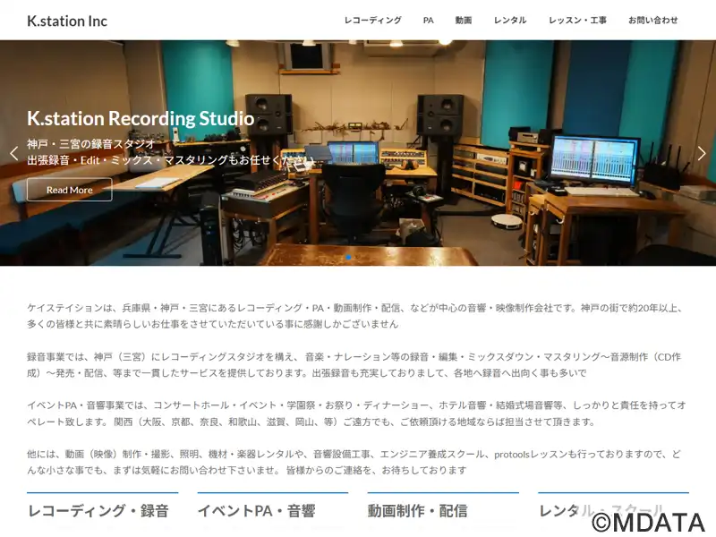 神戸・三宮に拠点を置く音響・映像・動画制作スタジオ。デッドな音響特性により、モニターの素直な再生を実現し、音の乱反射や整音に配慮した設計が特徴。定員約10人のコントロールルームを中心に、6人編成のバンドに対応可能なメインスタジオと、ボーカル録音ブースを備える。制作では録音や編集、ミックスダウン、マスタリング、配信まで一貫した対応が可能。コンサートやイベント、学園祭などでのPA・音響オペレートも提供。