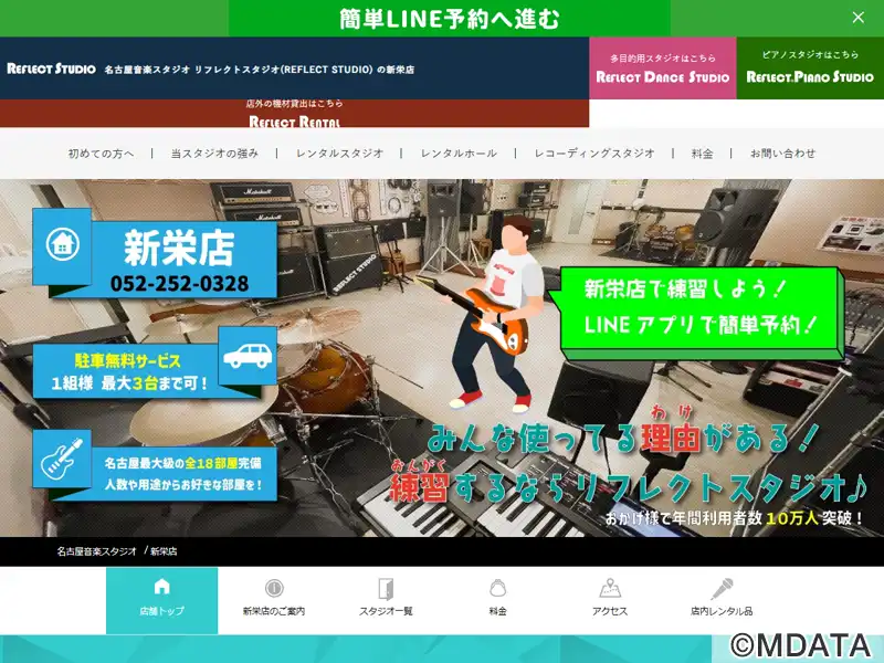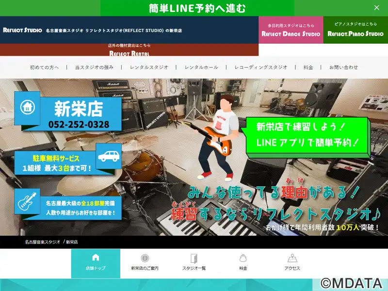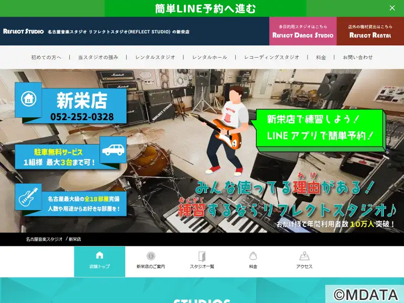 名古屋市中区にある、名古屋エリアでトップシェアの「リフレクトスタジオ」の新栄店。全16部屋を備えたグループでも最大規模のスタジオ。ロビーは広々としたスペースで、完全分煙、機材の預かり用の鍵付きロッカー、機材庫も完備している。施設内には、最大110名収容可能なイベントホール「新栄リフレクトホール」もあり、ライブイベントの開催やリハーサルにも利用できる。1グループ最大3台まで無料で駐車場を利用可能。