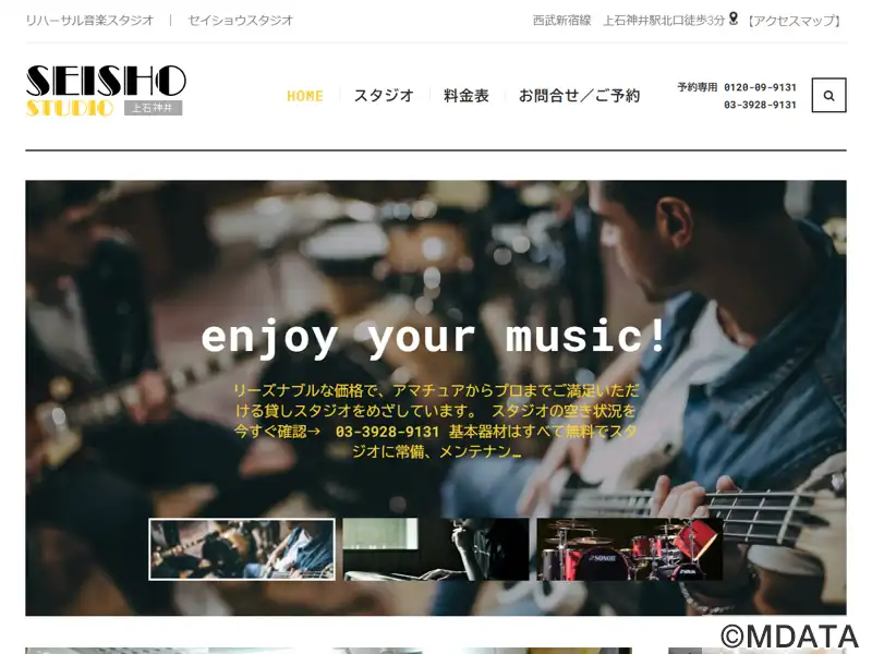 上石神井駅の北口から徒歩3分にあるリハーサルスタジオ。スタジオは3部屋で、16畳(A・B)、24畳(C)の広さ。アマチュアバンドの練習からプロのリハーサルまで対応する、多彩な機材を用意。常にメンテナンスを行って快適な環境を整えている。オプション機材も豊富で、特にスネアドラムはSONOR、dw、Ludwigなどの海外メーカー品も揃う。和太鼓レッスンの「タイコラボ練馬」の上石神井教室としても利用されている。